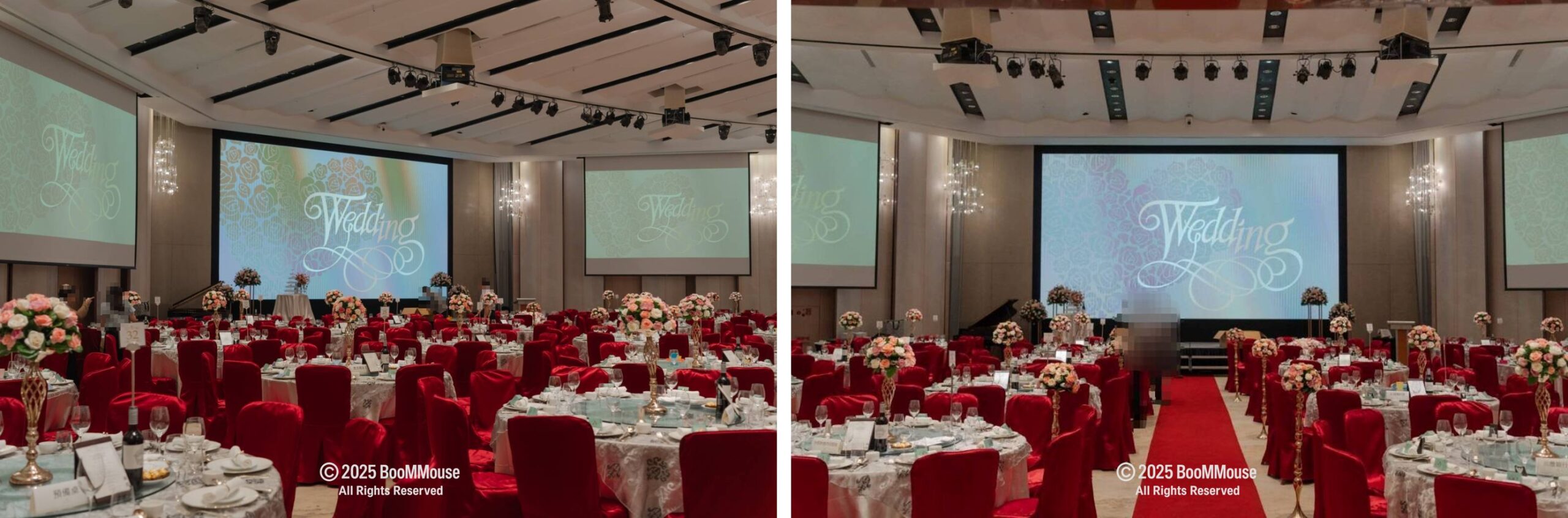 爆鼠與沙袋貓一看到遠東宴會廳就被這氣勢嚇一跳,內部空間非常寬闊挑高(挑得也夠高)且完全沒柱子,真的很完美!更讚的是四面八方都有懸掛的螢幕,不論坐在哪邊都不會有看不到螢幕的問題,爆鼠想到過往參加婚禮每次為了要看清楚螢幕總是在座位上左晃右晃避開前方人頭,遠東宴會廳整體不論是現場動態或是影片等等都不會有視線遮蔽區。
